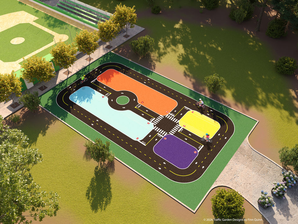 It combines essential street elements with efficient geometry to create a highly usable network suited to repurposed courts. Key features include both a four-way stop and a roundabout, providing a balanced mix of control and flow.
