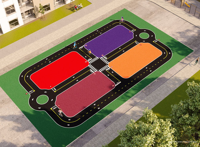 It brings essential street elements into a spacious layout suited to repurposed courts and larger paved areas. Key features include two outer-edge roundabouts that create continuous flow and multiple direction changes, along with a central four-way stop for focused skill practice.